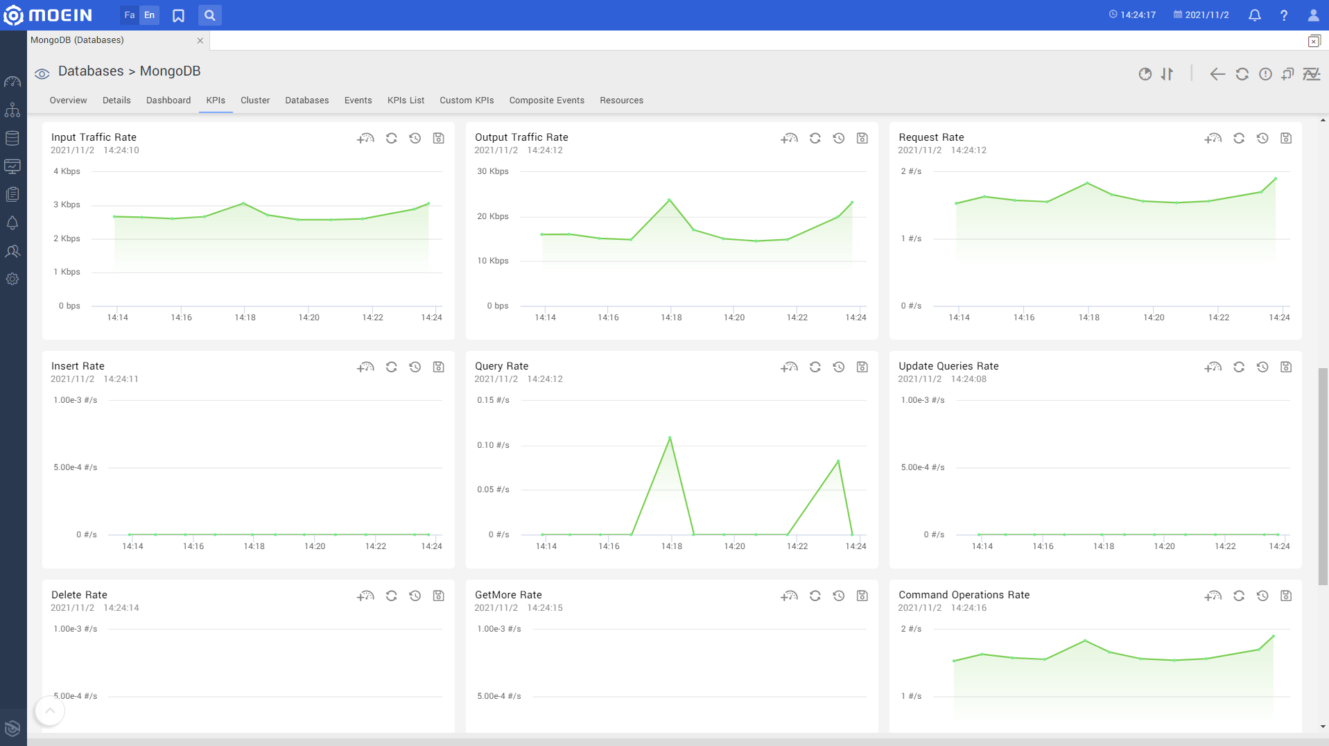 MongoDB is one of the leading NoSQL databases designed for scalability, high performance, and availability. This document-oriented database can be deployed in either stand-alone or clustered mode. The Moein monitoring system fully supports MongoDB monitoring in both configurations, collecting key performance indicators for databases, replica sets, shards, operations, transactions, and more. In clustered deployments, all cluster nodes are also monitored. The complete list of monitored metrics is provided below.